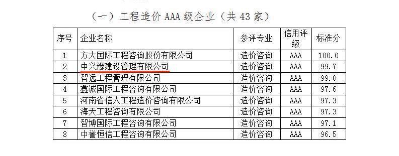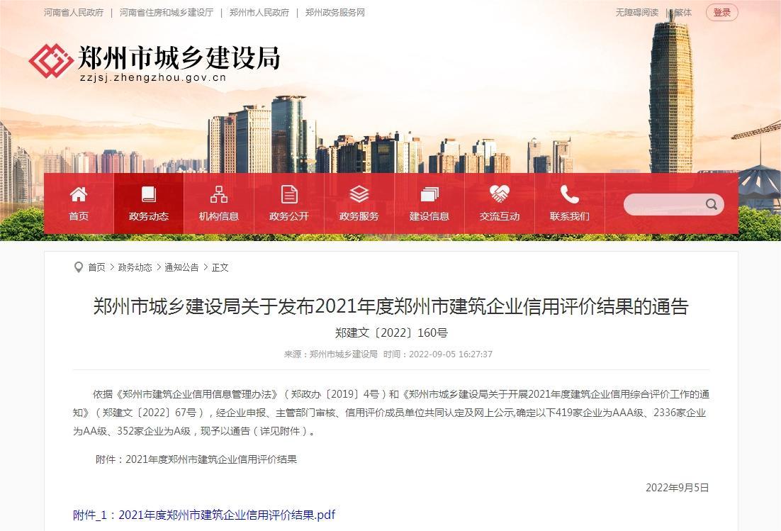 9月5日,鄭州市城鄉建設局公布了“鄭州市城鄉建設局關(guān)于發(fā)布2021年度鄭州市建筑企業(yè)信用評價(jià)結果的通告”。經(jīng)主管部門(mén)審核、信用評價(jià)成員單位共同認定,我公司榮獲鄭州市工程造價(jià)AAA級企業(yè)、鄭州市工程招標代理AAA級企業(yè)、鄭州市工程監理AA級企業(yè)。