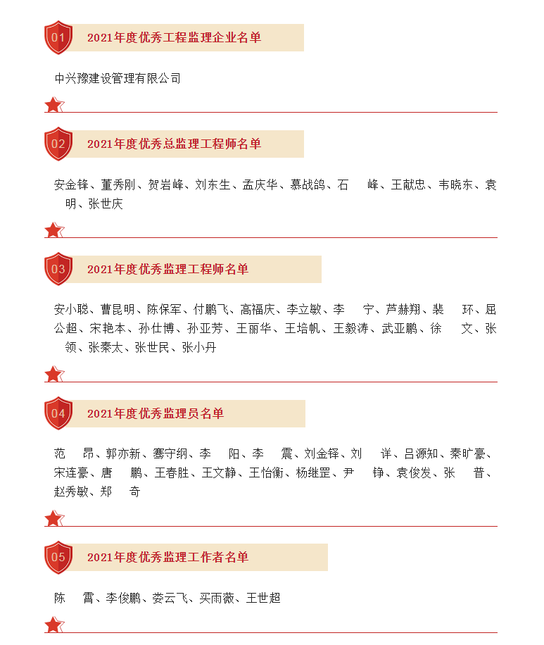 近日,河南省建設監理協(xié)會(huì )公布了關(guān)于表彰2021年度在黨團基層組織建設、公益慈善事業(yè)、誠信履職盡責、參與行業(yè)公共事務(wù)、推動(dòng)行業(yè)發(fā)展方面做出優(yōu)異成績(jì)的工程監理企業(yè)和從業(yè)人員名單,中興豫建設管理有限公司榮獲優(yōu)秀工程監理企業(yè)稱(chēng)號,公司多名員工分別獲得優(yōu)秀總監理工程師、優(yōu)秀監理工程師、優(yōu)秀監理員和優(yōu)秀監理工作者榮譽(yù)稱(chēng)號。