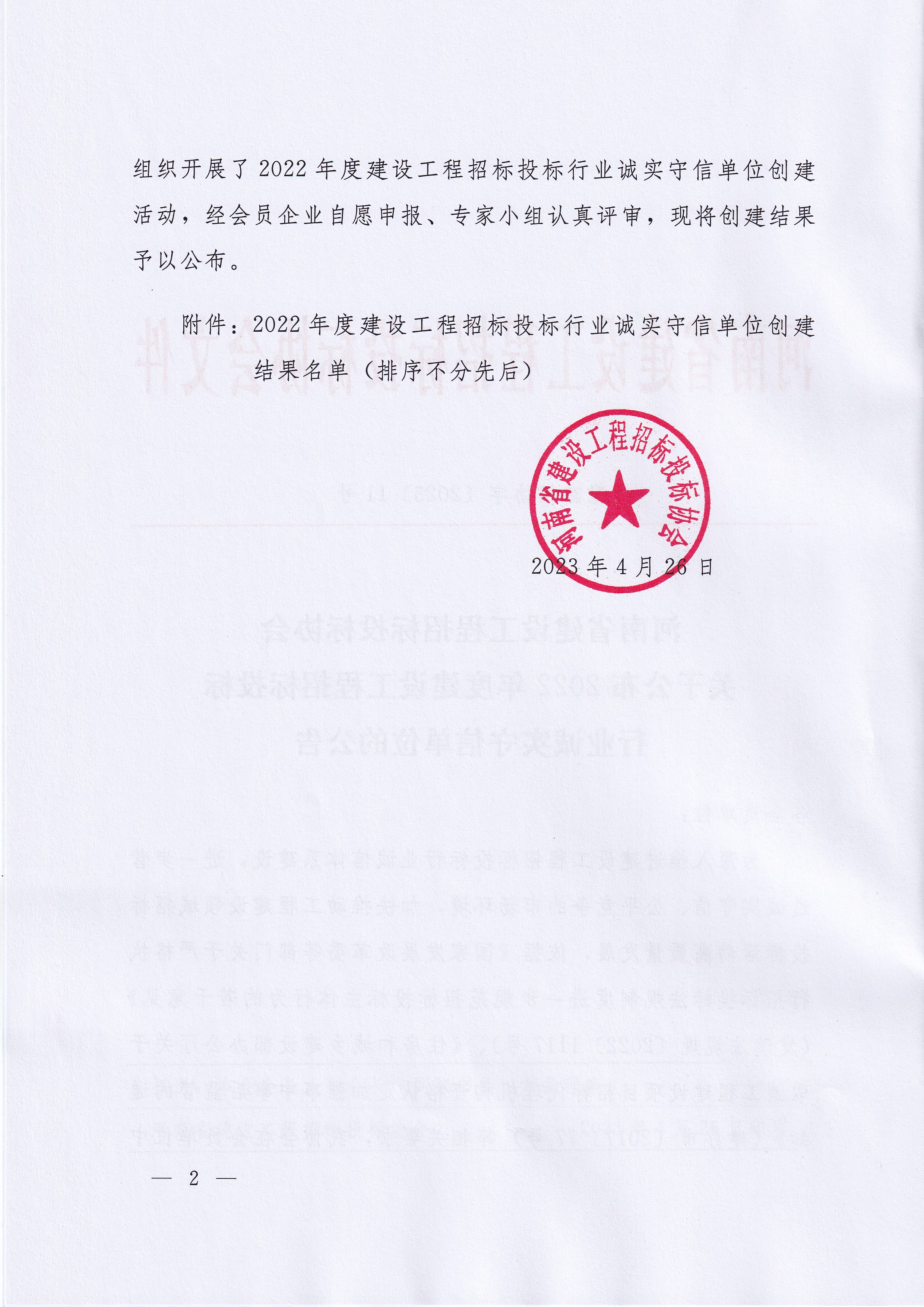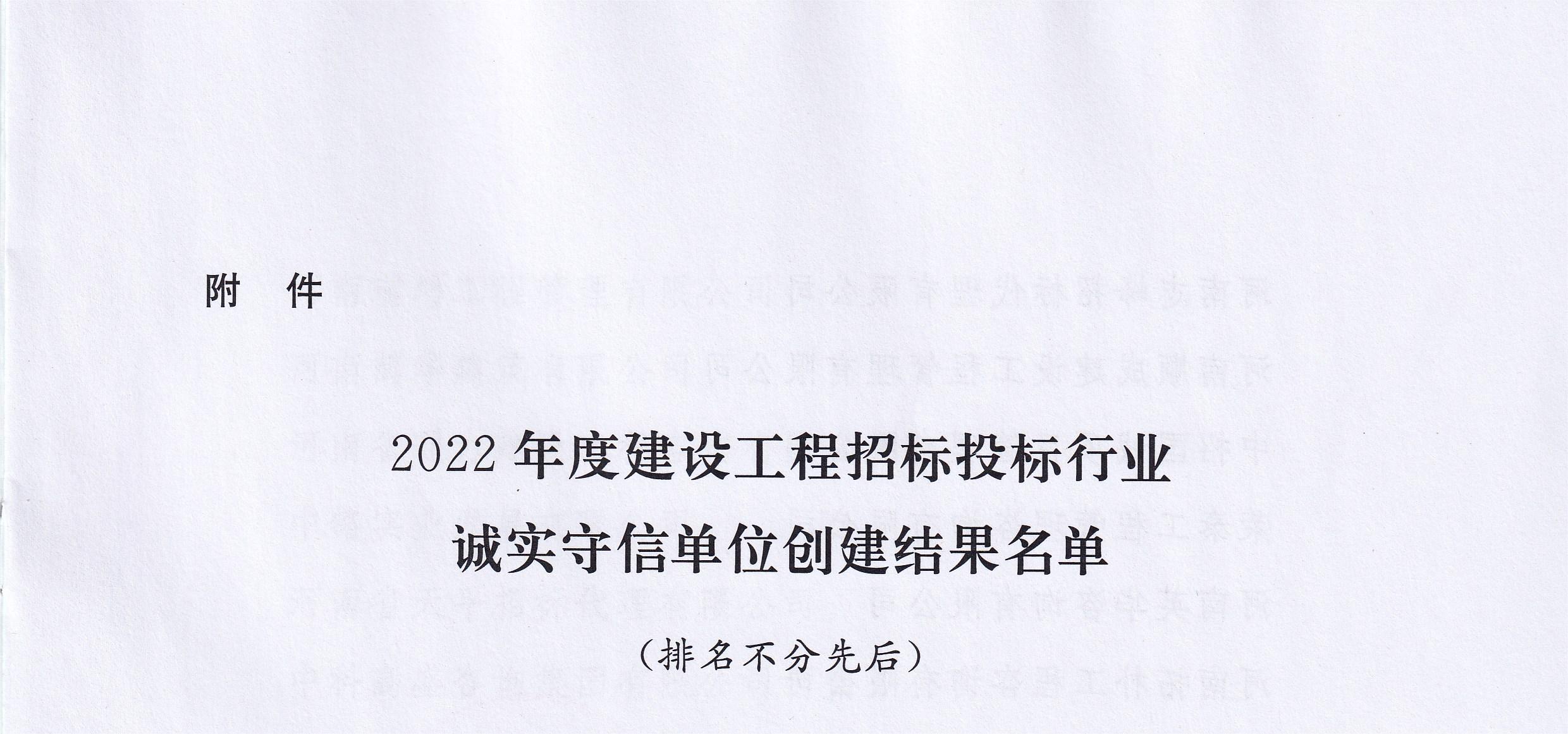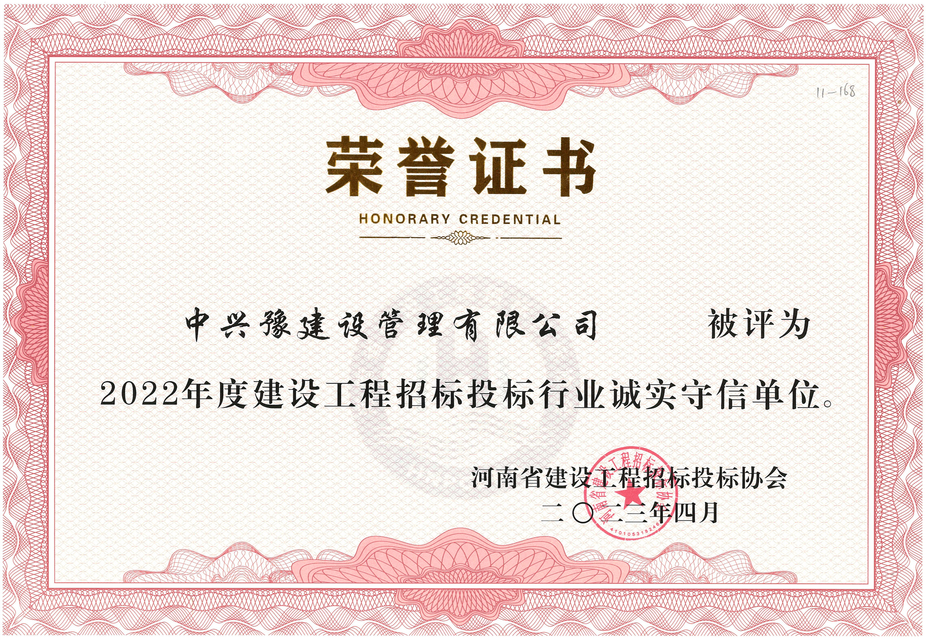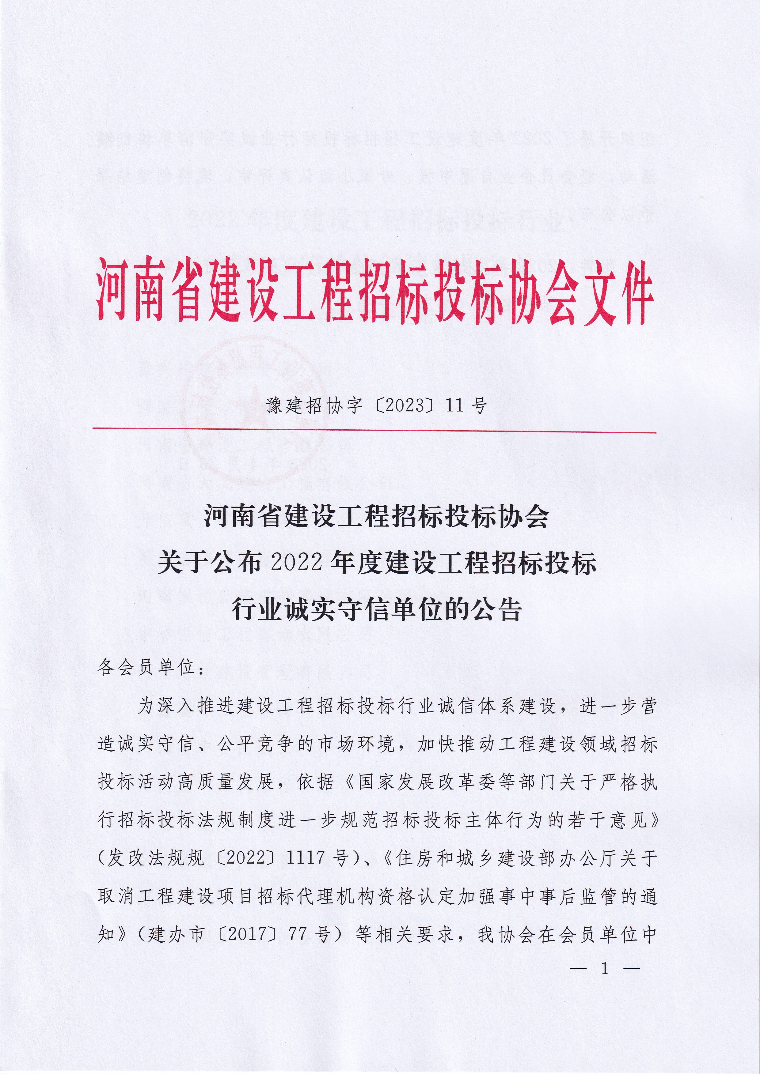 近日,河南省建設工程招標投標協(xié)會(huì )發(fā)布了《河南省建設工程招標投標協(xié)會(huì )關(guān)于公布2022年度建設工程招標投標行業(yè)誠實(shí)守信單位的公告》,中興豫建設管理有限公司被評為“2022年度河南省建設工程招標投標行業(yè)誠實(shí)守信單位”。