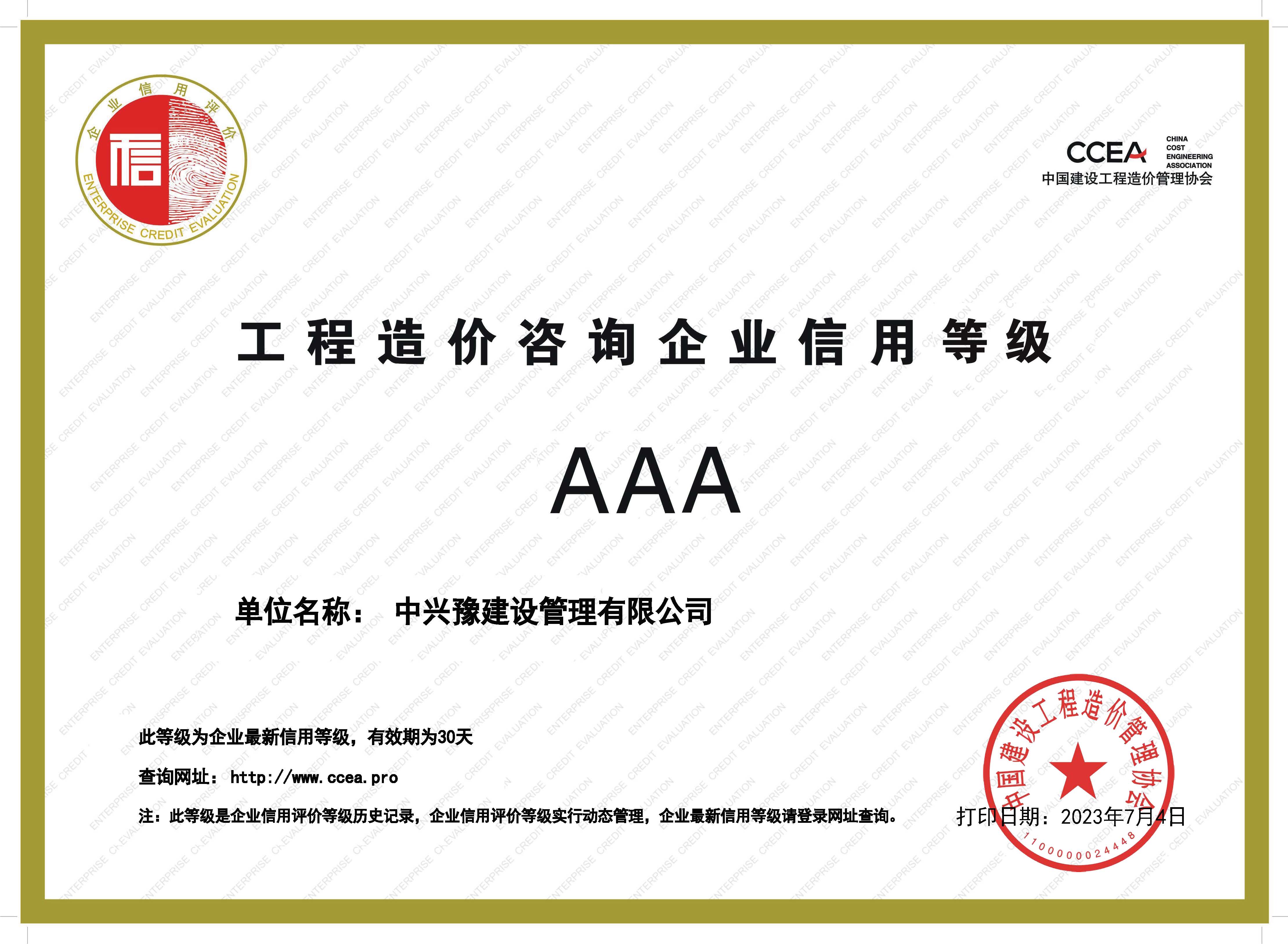 7月4日,中國建設工程造價(jià)管理協(xié)會(huì )發(fā)布關(guān)于公布2023年第一批工程造價(jià)咨詢(xún)企業(yè)信用評價(jià)結果的通知,經(jīng)企業(yè)申報、各省級工程造價(jià)行業(yè)協(xié)會(huì )初評,中價(jià)協(xié)組織專(zhuān)家終評等程序,中興豫建設管理有限公司榮獲中國建設工程造價(jià)管理協(xié)會(huì )信用評價(jià)AAA級!