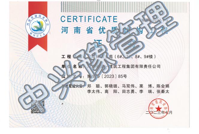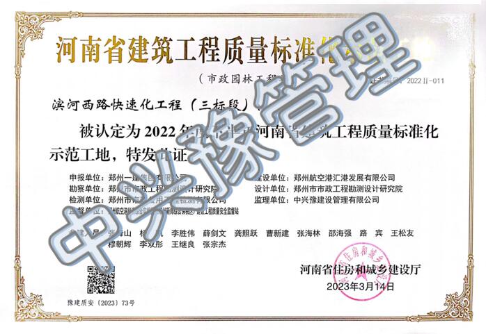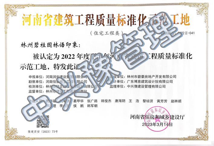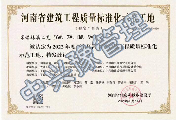 近日,我公司監理的常綠林溪上苑(6#樓、7#樓、8#樓、9#樓)項目榮獲“2022年度下半年河南省建筑工程質(zhì)量標準化示范工地”及“河南省優(yōu)質(zhì)結構工程”榮譽(yù)稱(chēng)號;林州碧桂園林語(yǔ)印象項目榮獲“2022年度下半年河南省建筑工程質(zhì)量標準化示范工地”榮譽(yù)稱(chēng)號;濱河西路快速化工程(三標段)項目榮獲“2022年度下半年河南省建筑工程質(zhì)量標準化示范工地”榮譽(yù)稱(chēng)號。