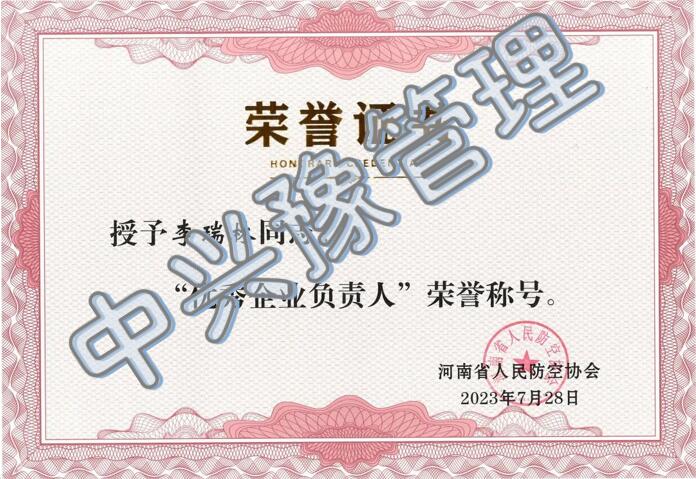 近日,河南省人民防空協(xié)會(huì )公布了“關(guān)于優(yōu)秀會(huì )員單位及個(gè)人結果的公告”。經(jīng)單位申請、專(zhuān)家評估、社會(huì )公示等程序,我公司榮獲優(yōu)秀會(huì )員單位榮譽(yù)稱(chēng)號,總裁李瑞林榮獲優(yōu)秀企業(yè)負責人榮譽(yù)稱(chēng)號。
