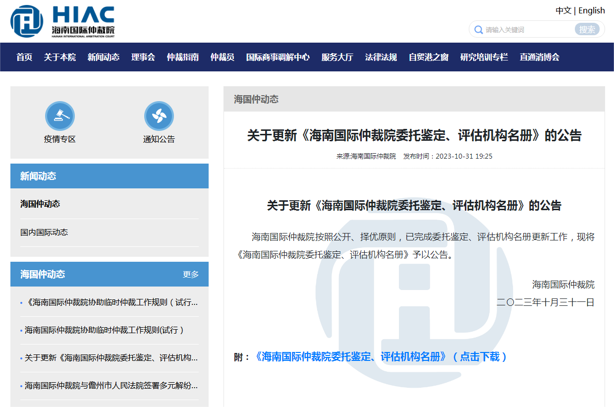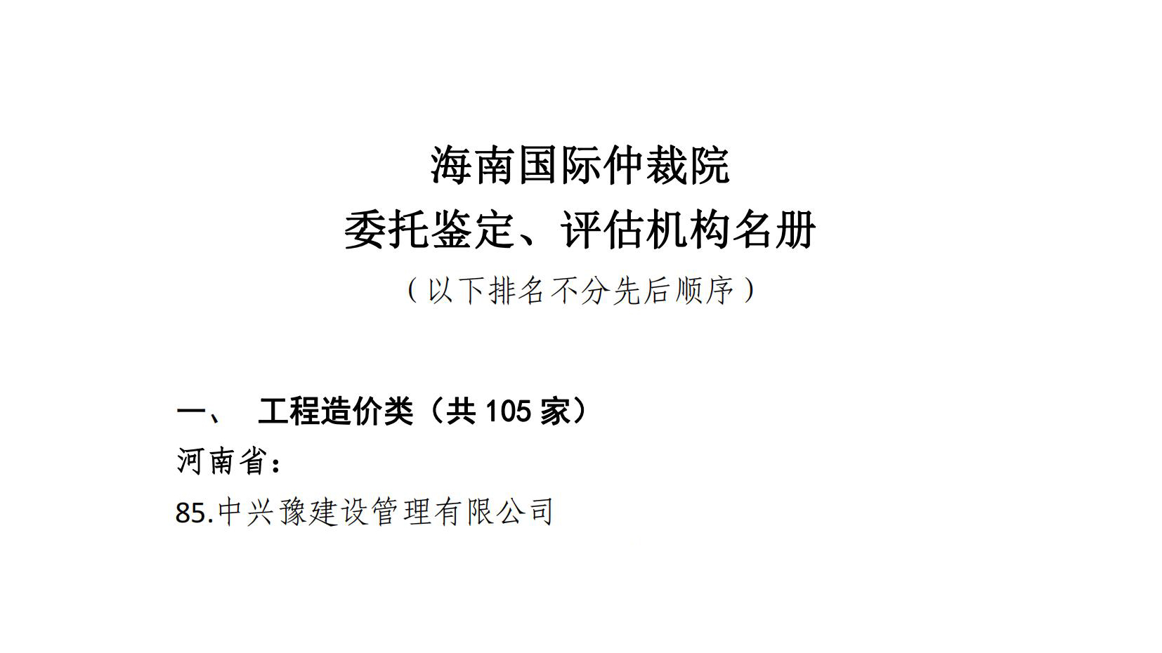 10月31日,海南國際仲裁院發(fā)布了“關(guān)于更新《海南國際仲裁院委托鑒定、評估機構名冊》的公告”,按照公開(kāi)、擇優(yōu)原則,中興豫建設管理有限公司被載入海南國際仲裁院委托鑒定、評估機構名冊。