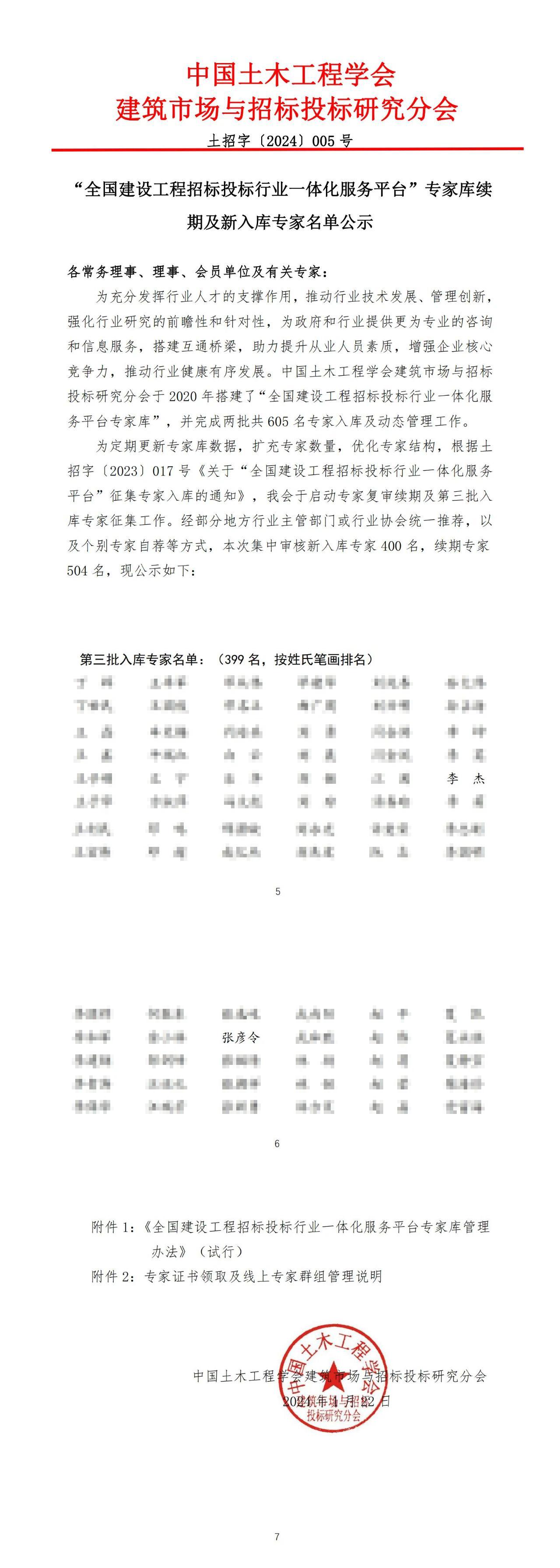 近日,中國土木工程學(xué)會(huì )建筑市場(chǎng)與招標投標研究分會(huì )公布了“全國建設工程招標投標行業(yè)一體化服務(wù)平臺”專(zhuān)家庫續期及新入庫專(zhuān)家名單的通知,我公司李杰、張彥令2名專(zhuān)家順利入圍專(zhuān)家庫。
