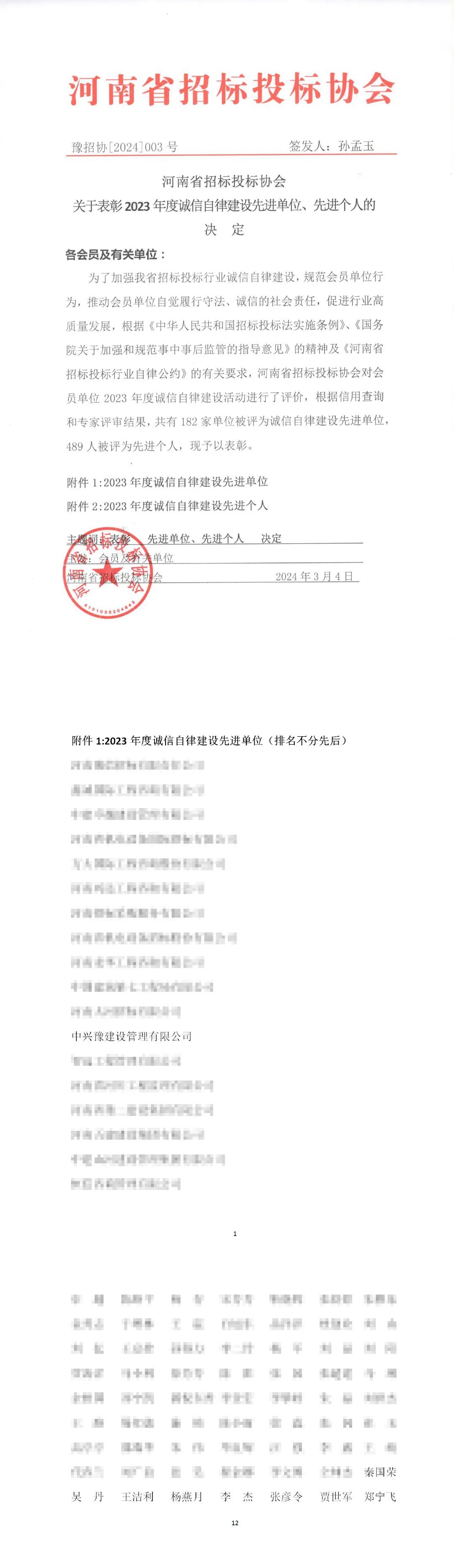 近日,河南省招標投標協(xié)會(huì )發(fā)布了《關(guān)于表彰2023年度誠信自律建設先進(jìn)單位、先進(jìn)個(gè)人的決定》,中興豫建設管理有限公司再次榮獲“誠信自律建設先進(jìn)單位”,八人榮獲“誠信自律建設先進(jìn)個(gè)人”榮譽(yù)稱(chēng)號。