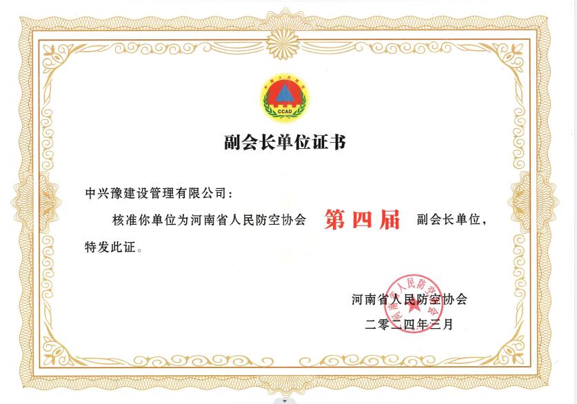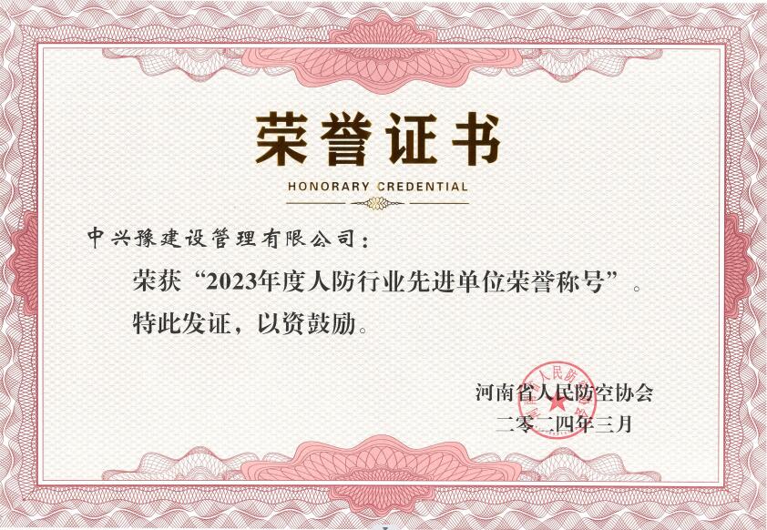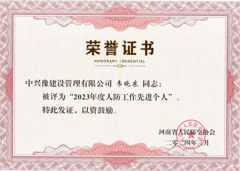 近日,河南省人民防空協(xié)會(huì )頒發(fā)了關(guān)于優(yōu)秀會(huì )員單位及先進(jìn)工作者的榮譽(yù)證書(shū),我公司核準為河南省人民防空協(xié)會(huì )第四屆副會(huì )長(cháng)單位、2023年度人防行業(yè)先進(jìn)單位,工程監理中心總經(jīng)理韋曉東榮獲2023年度人防工作先進(jìn)個(gè)人榮譽(yù)稱(chēng)號。