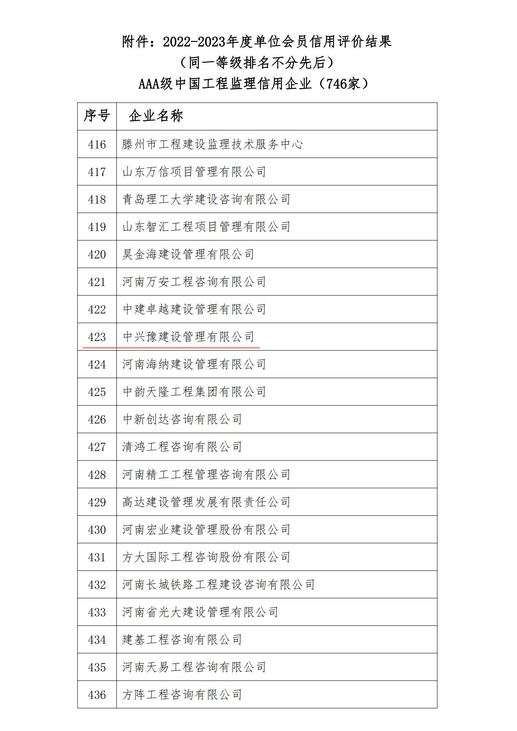 近日,中國建設監理協(xié)會(huì )發(fā)布了《關(guān)于2022-2023年度中國建設監理協(xié)會(huì )單位會(huì )員信用評價(jià)結果的公示》,經(jīng)自評、省級協(xié)會(huì )初評、專(zhuān)家評委綜合評審、公示、反饋、專(zhuān)家復核等評價(jià)程序,中興豫建設管理有限公司榮獲中國工程監理信用評價(jià)AAA級企業(yè)!