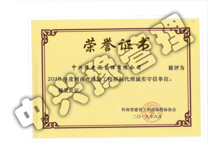 2018年度河南省建設工程招標代理誠實(shí)守信單位-公司榮譽(yù)