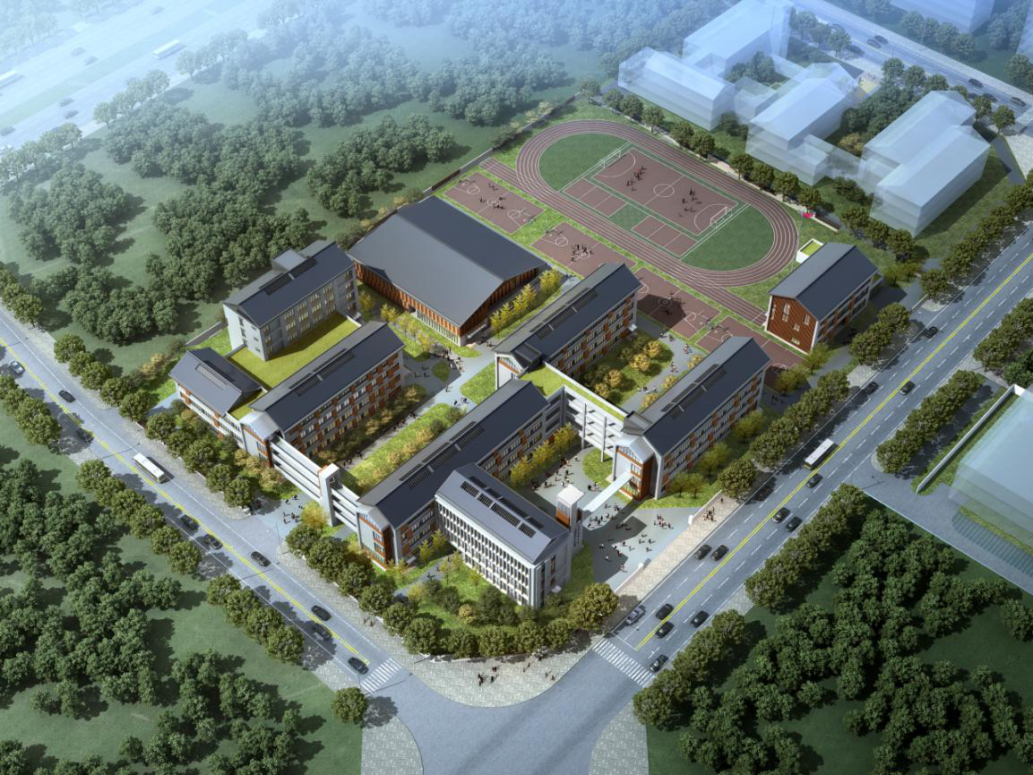 高級中學(xué)建筑面積100106.49m2,主要建筑包括:1#教學(xué)樓、2#游泳館、3#校史館、4#辦公樓、5#創(chuàng )客中心、6#圖書(shū)館、7#老師公寓、8#女宿舍、9#男宿舍、看臺、地下車(chē)庫。