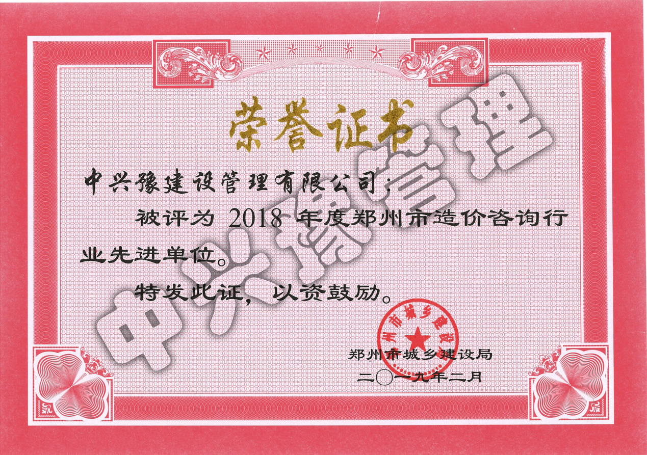 2018年度鄭州市造價(jià)咨詢(xún)行業(yè)先進(jìn)單位榮譽(yù)證書(shū)-公司榮譽(yù)