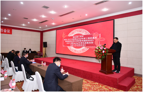 副總裁王明軍宣讀《關(guān)于對獲得2020年度工程質(zhì)量獎和榮譽(yù)獎的項目部表彰獎勵的決定》、《關(guān)于表彰2020年度先進(jìn)集體和先進(jìn)工作者的決定》,并號召全體同仁要以受到表彰的先進(jìn)集體和先進(jìn)工作者為榜樣,在學(xué)習先進(jìn)中提升自我,在對標先進(jìn)中持續奮斗,在爭當先進(jìn)中擔當作為,為中興豫的美好明天貢獻力量!