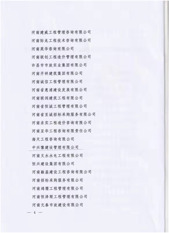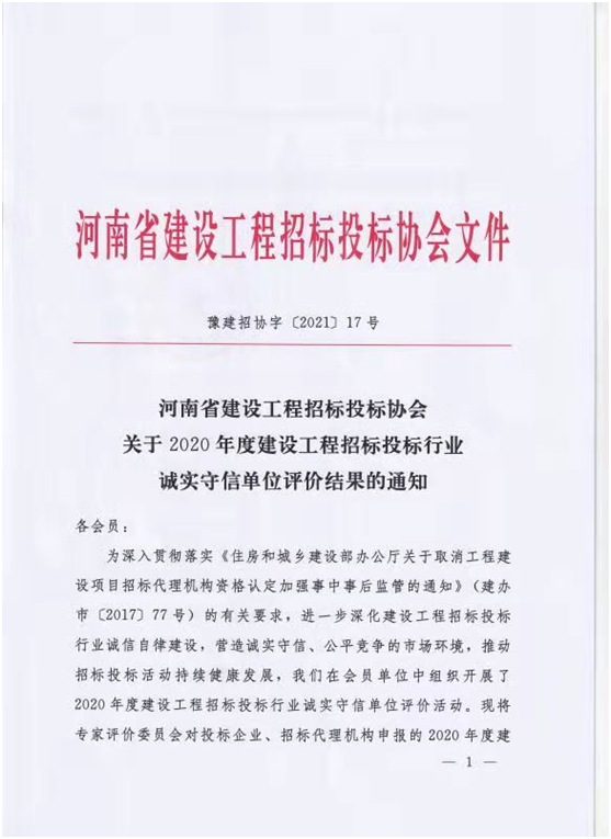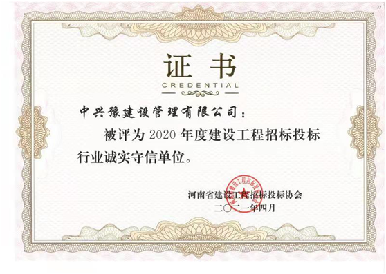 中興豫建設管理有限公司被評為“2020年度建設工程招標投標行業(yè)誠實(shí)守信單位”